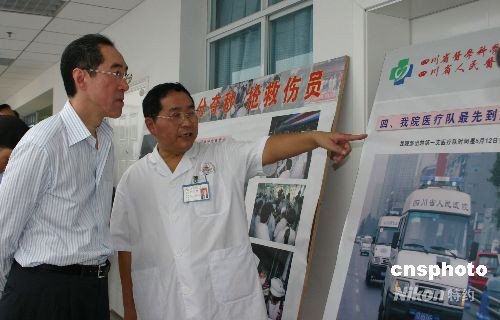香港政務(wù)司司長唐英年率領(lǐng)特區(qū)政府代表團20余人,來到成都四川省醫(yī)院慰問地震中受傷的民眾。圖為唐英年觀看圖板了解醫(yī)院救治地震傷員情況。中新社發(fā) 霍潺 攝