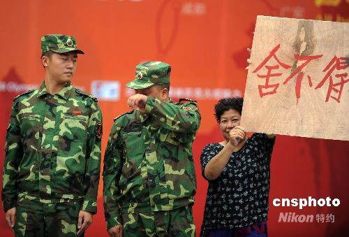 8月5日,奧運火炬在四川成都傳遞,在傳遞結(jié)束儀式上四川民眾為抗震官兵舉起“舍不得你們走”的標(biāo)語,抗震官兵感動抹淚。 中新社發(fā) 廖攀 攝
