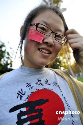 圖為剛到美國(guó)2年的高一女生自己制作了國(guó)旗貼紙和“北京歡迎你”字樣的T恤衫觀看北京奧運(yùn)開幕式轉(zhuǎn)播。中新社發(fā) 陳鋼 攝
