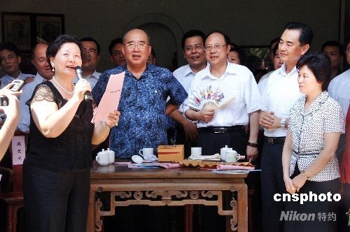 八月十四日下午,中國(guó)國(guó)民黨主席吳伯雄一行來(lái)到福建永定縣的高北土樓群參觀游覽,吳伯雄夫人戴美玉女士(左一)在“僑福樓”里即興演唱客家山歌。中新社發(fā) 鄭祚聲 攝