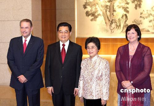 圖為胡錦濤夫婦歡迎出席奧運會閉幕式的國際奧委會主席羅格夫婦。
