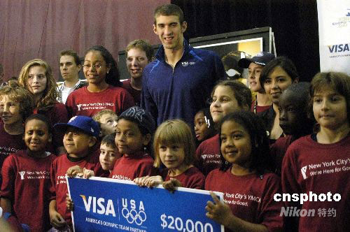 美國游泳運動員菲爾普斯28日出現(xiàn)在紐約青年會游泳館,參加為推進兒童游泳項目而進行的一項捐款活動。他說,“孩子們應(yīng)該在安全、設(shè)施完好的地方進行鍛煉,追求他們自己的奧林匹克夢想”。中新社發(fā) 魏晞 攝