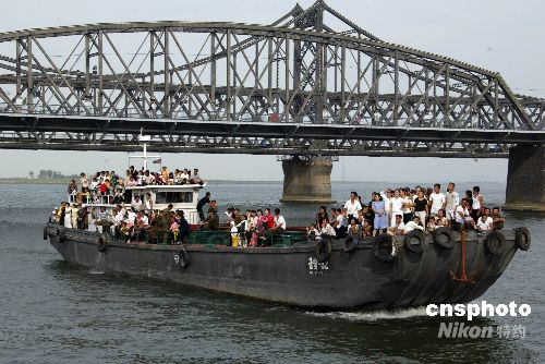 朝鮮建國60周年 新義洲民眾暢游鴨綠江(2)