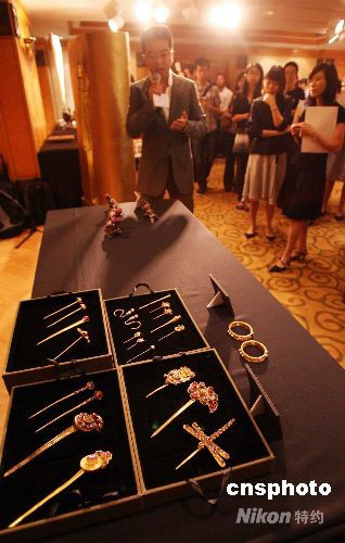 九月十日,香港國際藝展公司向傳媒展示一套華美精巧的黃金發(fā)飾,估計(jì)拍賣價在八百萬港元。該公司主辦的 “2008香港國際古玩及藝術(shù)品博覽會”將在十月四日至七日在會展中心舉行。中新社發(fā) 洪少葵 攝