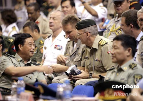 圖為駐香港部隊(duì)司令員張仕波少將與武官團(tuán)交流。中新社發(fā) 張勤 攝