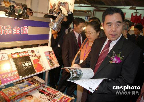 9月20日,第四屆海峽兩岸圖書(shū)交易會(huì)在臺(tái)北世貿(mào)中心三館開(kāi)幕,中新社主辦的《中國(guó)新聞周刊》現(xiàn)身第四屆海峽兩岸圖書(shū)交易會(huì)。圖為大陸參訪團(tuán)團(tuán)長(zhǎng)、新聞出版署署長(zhǎng)柳斌杰參觀大陸期刊綜合展區(qū)時(shí),觀看《中國(guó)新聞周刊》。中新社發(fā) 陳立宇 攝