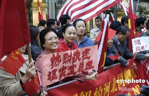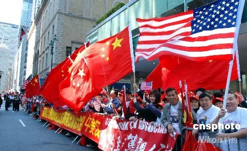 中國總理溫家寶于23日上午乘專機(jī)抵達(dá)紐約,當(dāng)?shù)財(cái)?shù)千華僑華人一早即聚集在他下榻的酒店附近夾道歡迎。中新社發(fā) 鄧悅 攝