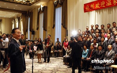 9月23日下午,抵達紐約的中國總理溫家寶與當?shù)厝A人華僑、中國駐外機構(gòu)代表和留學(xué)生等見面。中新社發(fā) 李靜 攝