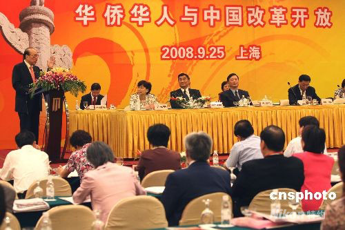 9月25日,中國(guó)僑聯(lián)主辦的“華僑華人與中國(guó)改革開(kāi)放紀(jì)念大會(huì)”在上海舉行,來(lái)自20多個(gè)國(guó)家和地區(qū)的300余名僑領(lǐng)、華商共聚一堂,圍繞“華僑華人與中國(guó)改革開(kāi)放”主題,共敘中國(guó)改革開(kāi)放30年取得的偉大成果。中新社發(fā) 史利 攝