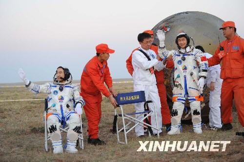 9月28日,神舟七號飛船返回艙順利著落,三名航天員翟志剛、劉伯明、景海鵬在經(jīng)過15-20分鐘的重力再適應(yīng)后全部出艙。首先出艙的是翟志剛,第二個出艙的是劉伯明,第三個出艙的是景海鵬。 在出艙后三位航天員接受了記者簡單的采訪。