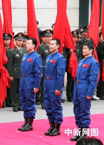 神舟七號(hào)飛船航天員翟志剛、劉伯明、景海鵬29日乘專(zhuān)機(jī)抵達(dá)北京后,當(dāng)日回到北京航天城,受到民眾的夾道歡迎。中新社記者 齊彬 攝