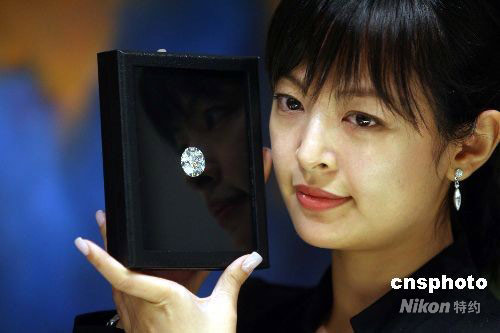 十月八日,香港佳士得向傳媒展示一批將于十二月二日拍賣的瑰麗珠寶首飾,圖中的四十四點(diǎn)四六克拉完美無(wú)暇巨鉆,估價(jià)超過(guò)六千萬(wàn)港元。中新社發(fā) 洪少葵 攝