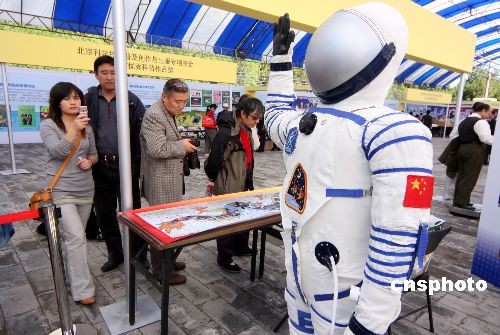 10月10日,“神七”模型和中國造“飛天”太空艙外航天服吸引眾多市民參觀拍照。當(dāng)日,“太空禮贊·中國‘神舟’載人航天展覽”亮相北京地壇圖書節(jié)。據(jù)悉,按照1:5比例制作的‘神舟七號’飛船模型可謂是本次展覽的一大亮點(diǎn),這也是該模型首次在公眾面前展示,同類模型目前只在北京航天飛行控制中心內(nèi)有一個(gè)。中新社發(fā) 吳芒子 攝