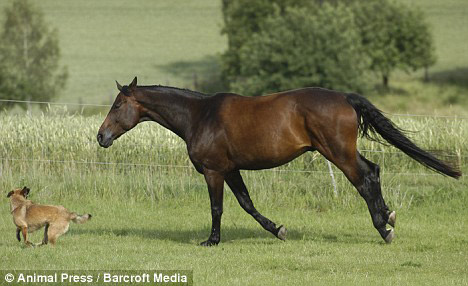 當(dāng)時,一條比利時牧羊犬正在追逐一匹混血馬,不料這匹任性的馬卻不聽牧羊犬的“指揮”,當(dāng)即脾氣大發(fā),掉頭對牧羊犬反擊,試圖用嘴咬牧羊犬的尾巴。受到驚嚇的牧羊犬壓著尾巴灰溜溜地逃跑。