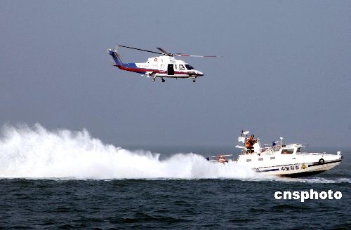 10月23日下午,廈金航線海上搜救演習在廈門灣水域舉行,海峽兩岸共出動25艘船舶、16艘輔助船舶以及兩艘直升機參與演習。演習的目的是為了檢驗兩岸直航航線搜救應急預案的科學性和可操作性,檢閱實際搜救指揮協(xié)調(diào)能力和搜救成效,以更好地保障廈金航線海上運輸和海上作業(yè)安全。圖為直升機和海上救助船舶進行救人演練。中新社發(fā) 王東明 攝