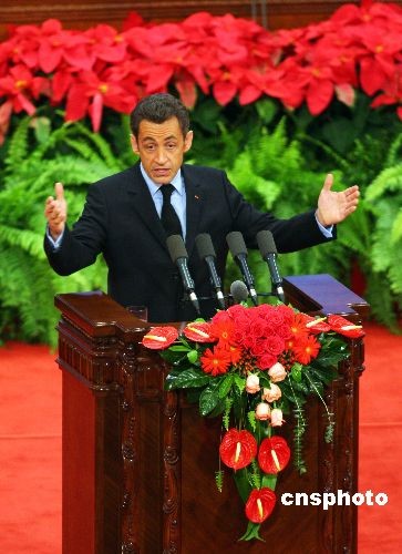法國總統(tǒng)薩科齊在開幕式上發(fā)表講話。中新社發(fā) 廖文靜 攝