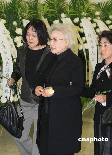 曾在謝晉導(dǎo)演拍攝的《女籃5號(hào)》里出演女主角、現(xiàn)已86歲高齡的老藝術(shù)家秦怡(中)也親自到場(chǎng),為老朋友送行。中新社發(fā) 湯彥俊 攝