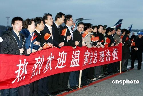 溫家寶在機(jī)場受到俄副外長博羅達(dá)夫金等俄方官員的熱情迎接并出席了歡迎儀式。