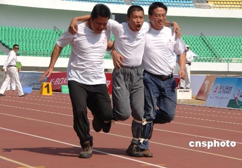 十月二十八日,臺灣選手邱學申、梁世英、汪勛武(中)在農運會“男子60米3人四足跑”比賽中同心協力爭向前。賽后汪先生在接受媒體采訪時說:這是他第二次參加全國農運會,上一屆他是以臺灣游泳隊領隊身份參賽。中新社發(fā) 鄭祚聲 攝