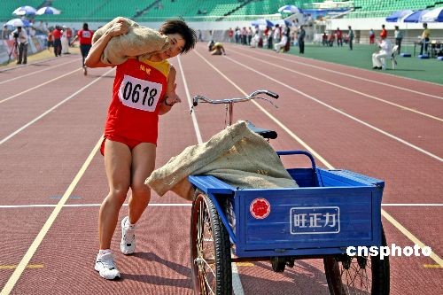 圖為女子60米搶收糧食進(jìn)倉(cāng)比賽中選手把“搶收的糧食”裝上三輪車。中新社發(fā) 傅丹丹 攝