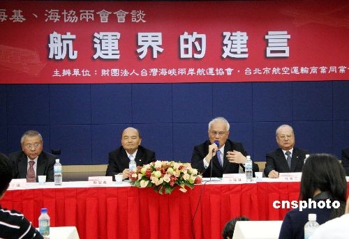 10月30日下午,臺灣海空航運(yùn)業(yè)界代表由臺灣海峽兩岸航運(yùn)協(xié)會常務(wù)顧問、長榮集團(tuán)首席副總裁林省三牽頭,與臺灣領(lǐng)導(dǎo)人馬英九見面并遞交陳情書,希望即將在臺北登場的陳云林與;鶗麻L江丙坤會談能排除萬難,實現(xiàn)?罩焙剑龠M(jìn)兩岸經(jīng)貿(mào)發(fā)展,造福于民。隨后,他們在臺北舉行記者會,表示非常歡迎海協(xié)會會長陳云林訪臺,并期盼兩岸直航早日落實。中新社發(fā) 黃少華 攝