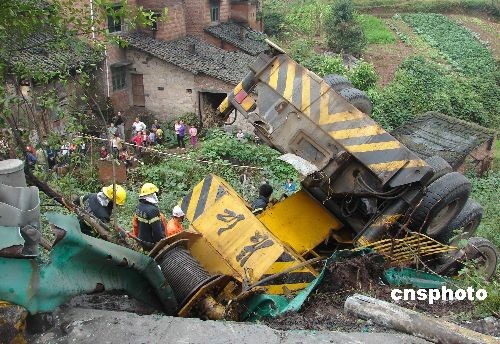 11月2日11時50分許,渝黔高速公路重慶至一品段10公里處,一輛長江牌吊車因爆胎導(dǎo)致車輛失控,沖出護欄發(fā)生側(cè)翻,造成1人死亡,1人重傷。中新社發(fā) 張東清 攝