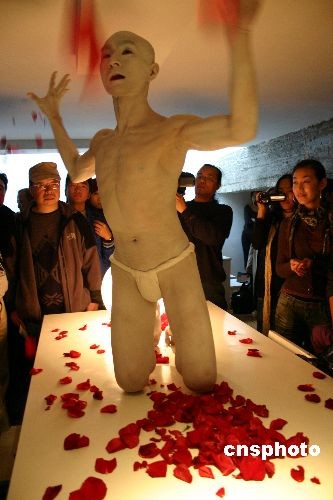 11月2日下午,馬來西亞的華裔舞者李瑞強在北京鼓樓東大街的一家酒吧為大家表演現(xiàn)代舞“人與神”。中新社發(fā) 郭海鵬 攝