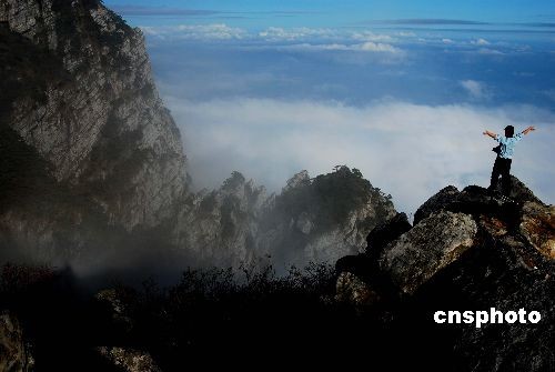 圖為四日一名攝影師在廬山五老峰上“擁抱”云海。