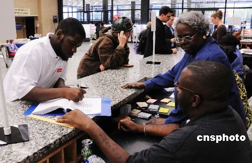 今年非洲裔居民百分之九十以上注冊成為選民。圖為一位非洲裔選民在華盛頓特區(qū)投票站填寫有關(guān)投票的表格。中新社發(fā) 邱江波 攝