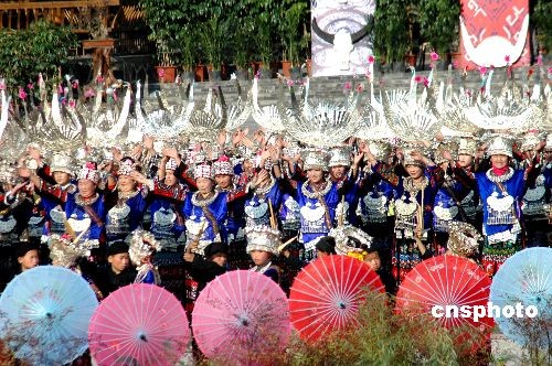 11月9日,貴州黔東南雷山縣幾千苗族同胞進(jìn)行采排,為2008年11月10日舉行的雷山苗年開幕式作準(zhǔn)備,采排現(xiàn)場(chǎng)盛況空前。中新社發(fā) 吳興權(quán) 攝
