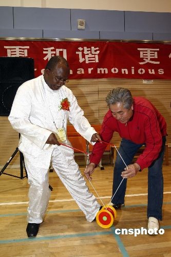 圖為非洲友人向市民學(xué)習(xí)抖空竹。