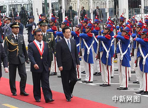 中國(guó)國(guó)家主席胡錦濤二十日在秘魯國(guó)會(huì)大廈前檢閱秘魯三軍儀仗隊(duì)。中新社記者 齊彬攝