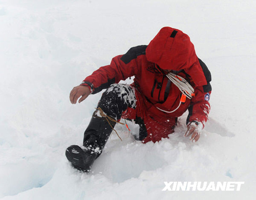 由于南極大陸周圍多年未化的“老冰”和剛剛結(jié)成的“新冰”混合一起,堵死了“雪龍”號前進(jìn)的航線,25日晚6時,“雪龍”號有關(guān)負(fù)責(zé)人決定由船上隊員組成探冰隊下船察看冰情。