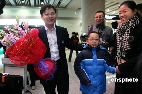 11月30日清晨5點(diǎn)30分左右,滯留泰國(guó)的中國(guó)公民搭乘中國(guó)國(guó)際航空公司的CA072航班順利抵達(dá)北京首都國(guó)際機(jī)場(chǎng)。圖為從泰國(guó)返回北京的中國(guó)公民黃忠(左)走出機(jī)場(chǎng),他的妻兒到機(jī)場(chǎng)迎接。