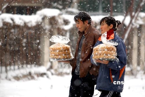 12月2日,新疆烏魯木齊市兩位維吾爾族市民手捧為即將到來(lái)的古爾邦節(jié)特意購(gòu)買(mǎi)的馓子,匆忙回家。受西西伯利亞南下的強(qiáng)冷空氣影響,從12月1日白天開(kāi)始到2日夜間,新疆主要以降溫大風(fēng)天氣為主,同時(shí)新疆北部地區(qū)將有較明顯的降雪。中新社發(fā) 劉新 攝