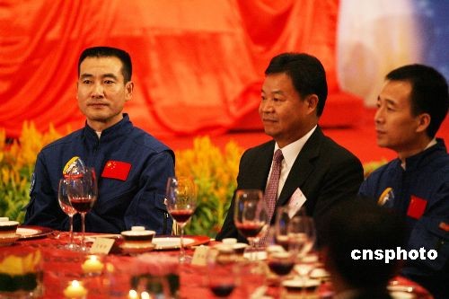 圖為神舟七號航天員翟志剛、景海鵬等在宴會上。