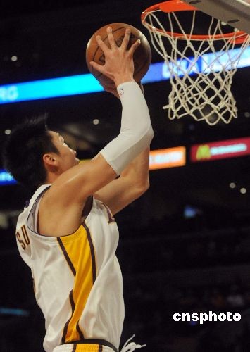 當?shù)貢r間十二月七日晚,NBA洛杉磯湖人隊在主場以一百零五比九十二輕取雄鹿隊,中國球員孫悅首度在NBA常規(guī)賽上登場,共取得四分。圖為孫悅上籃得分。中新社發(fā) 張煒 攝