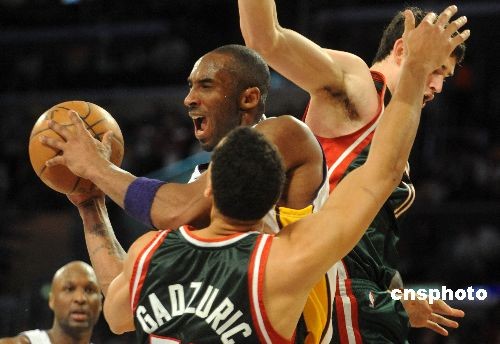 當(dāng)?shù)貢r間十二月七日晚,NBA洛杉磯湖人隊在主場以一百零五比九十二輕取雄鹿隊。其中湖人后衛(wèi)科比·布萊恩特上場三十一分鐘,奪得二十分。中新社發(fā) 張煒 攝