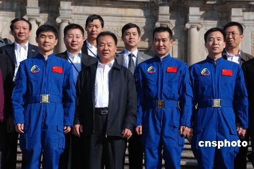 圖為代表團(tuán)團(tuán)長(zhǎng)張建啟及航天員翟志剛、劉伯明、景海鵬等在牌坊前合影留念。中新社發(fā) 畢永光 攝