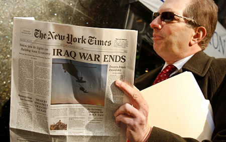 紐約一名讀者正在閱讀一份假的《紐約時(shí)報(bào)》,報(bào)紙的頭版頭條竟然是伊拉克戰(zhàn)爭(zhēng)結(jié)束。盡管報(bào)頭、字體、字型都達(dá)到了以假亂真的程度,但它仍然是“贗品”,這份由專門戲弄名人和名組織機(jī)構(gòu)的“應(yīng)聲蟲”組織偽造的《紐約時(shí)報(bào)》上標(biāo)明的發(fā)行日期是2009年7月4日,據(jù)稱,他們是希望通過此舉達(dá)到鞭策新當(dāng)選總統(tǒng)奧巴馬恪守承諾的目的。
