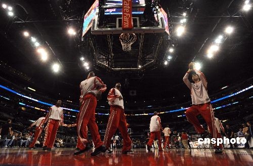 圖為火箭隊(duì)賽前熱身。中新社發(fā) 張煒 攝