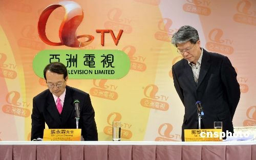 十二月十五日,香港亞洲電視執(zhí)行主席張永霖(左)、高級(jí)副總裁鄺凱迎在大埔總臺(tái)舉行的記者會(huì)上稱,二零零八亞洲小姐競(jìng)選賽果與投票結(jié)果不符,亞視將對(duì)此進(jìn)行調(diào)查。圖為二人就事件鞠躬道歉。中新社發(fā) 鄧慶樂(lè) 攝
