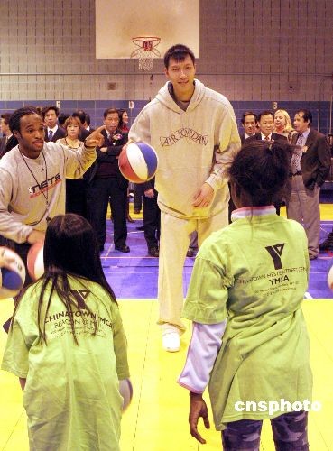 圖:易建聯(lián)與紐約小球迷切磋球藝