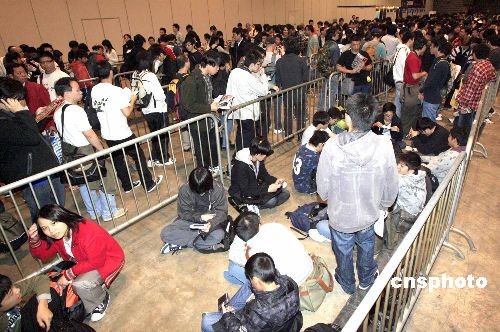 十二月十九日,一年一度的“亞洲游戲展2008”在香港會(huì)展中心舉行。圖為游戲迷們?cè)缭鐏?lái)到門(mén)口排隊(duì)等候進(jìn)場(chǎng)。中新社發(fā) 張勤 攝