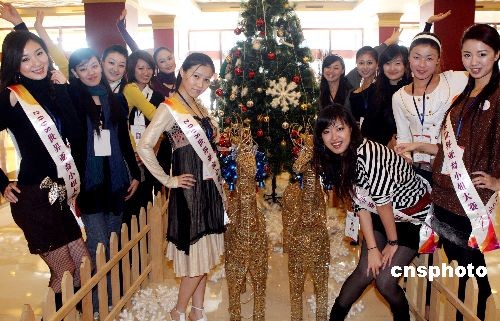 圖為參賽佳麗在圣誕裝飾景前拍照。