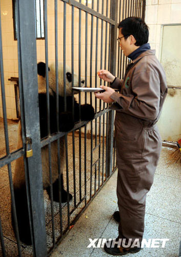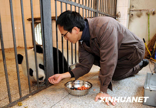 12月21日,臺(tái)北木柵動(dòng)物園飼養(yǎng)員正在學(xué)習(xí)照顧“團(tuán)團(tuán)”、“圓圓”。 從2008年10月開始,臺(tái)北木柵動(dòng)物園的3名飼養(yǎng)員分兩批來(lái)到中國(guó)保護(hù)大熊貓研究中心四川雅安碧峰峽基地,學(xué)習(xí)大熊貓飼養(yǎng)技術(shù)。目前,他們和贈(zèng)臺(tái)大熊貓“團(tuán)團(tuán)”“圓圓”已經(jīng)建立感情,基本掌握了大熊貓飼養(yǎng)技術(shù)。