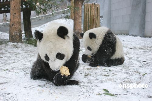2006年1月,臥龍降雪團團圓圓玩滾雪球。中新社發(fā) 衡毅 攝