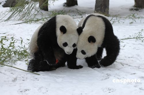 2008年1月,團(tuán)團(tuán)圓圓卿卿我我,面對(duì)鏡頭毫不避嫌。中新社發(fā) 衡毅 攝