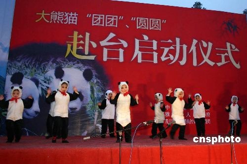 12月23日是贈(zèng)臺(tái)大熊貓“團(tuán)團(tuán)”、“圓圓”飛赴臺(tái)灣的日子,“團(tuán)團(tuán)”“圓圓”離開(kāi)四川,雅安民眾舉行了熱烈的歡送儀式。圖為當(dāng)?shù)氐摹靶茇垖殞殹北硌菸璧浮缎茇埱椤。中新社發(fā) 霍潺 攝