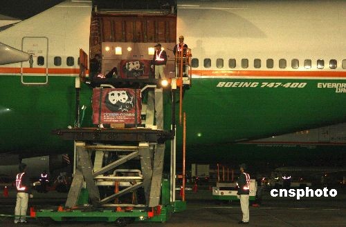 抵達(dá)臺(tái)北桃園機(jī)場(chǎng)的大陸贈(zèng)臺(tái)大熊貓“團(tuán)團(tuán)”、“圓圓”經(jīng)過檢疫程序后,它們的箱籠從長(zhǎng)榮航空專機(jī)出艙。中新社發(fā) 陳立宇 攝